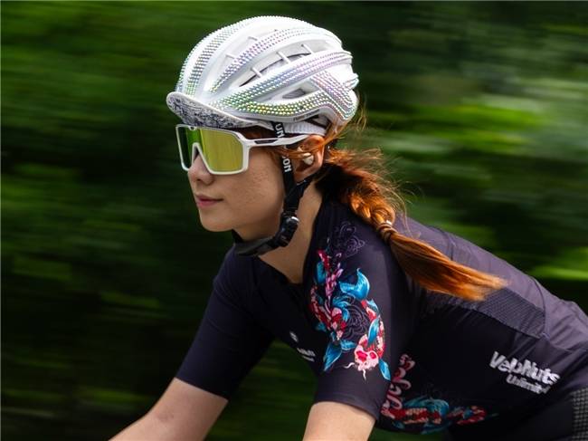 下面这张照片,在拍摄时关闭了EOS R1的摇摄辅助功能,通过M档光圈以及快门速度的组合,得到了极具动感的骑行画面。由于在摇摄过程中需要快速移动相机追踪骑行的运动员,所以放大查看照片发现,运动员主体依然有些模糊,细节并不清晰。